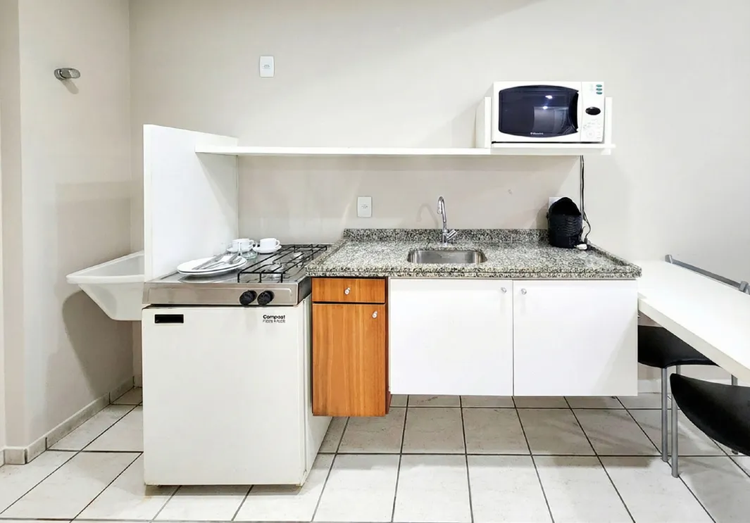 Tem cozinha equipada com armários, forno micro-ondas, fogão, frigobar e uma pequena área de serviço com tanque.