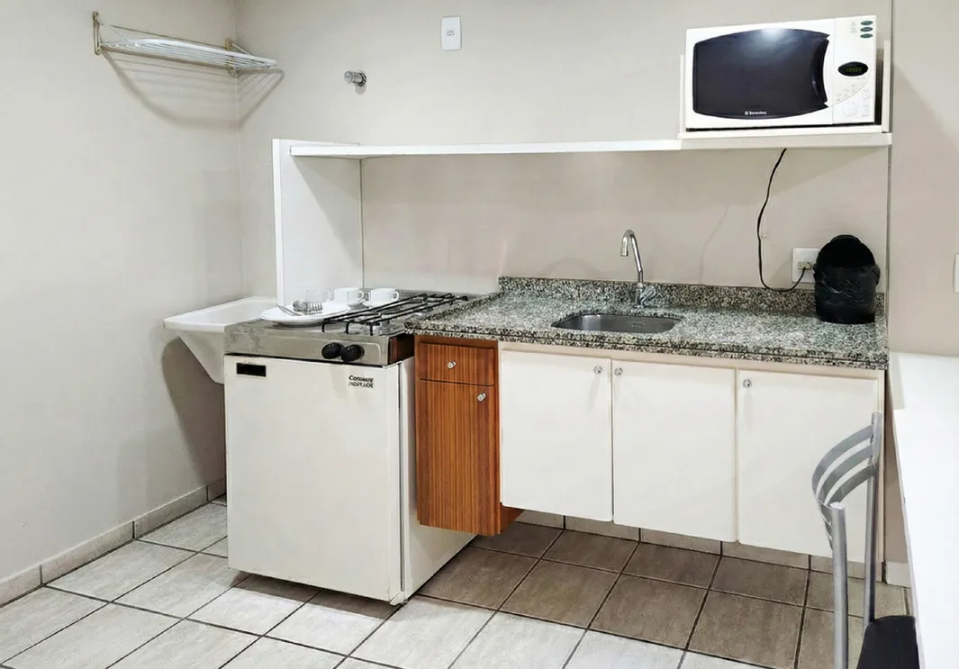 Tem cozinha equipada com armários, forno micro-ondas, fogão, frigobar e uma pequena área de serviço com tanque.