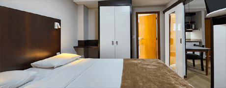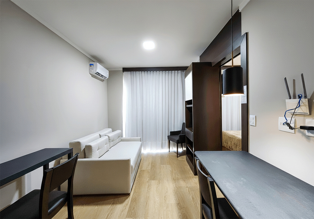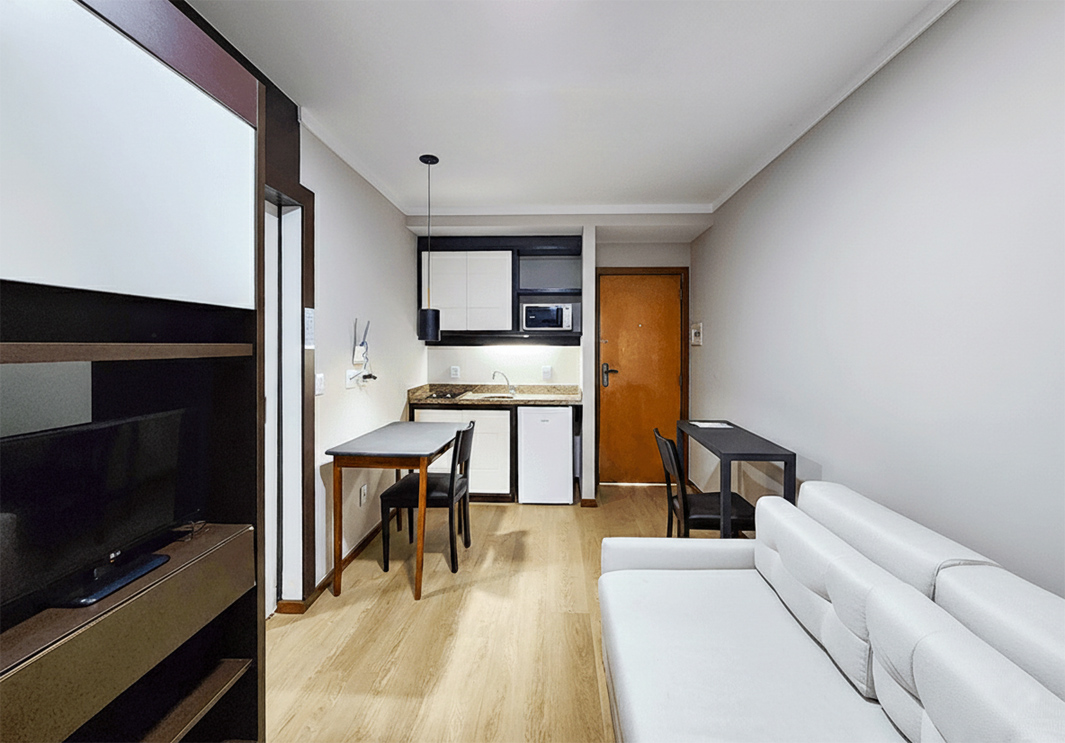 Quarto com 1 cama de casal, varanda, sala de estar com sofá de dois lugares, banheiro privativo, chuveiro com água quente, secador de cabelo, cofre, pequena cozinha com frigobar, micro-ondas, pequeno fogão elétrico, ar condicionado, internet wi-fi e TV a cabo.