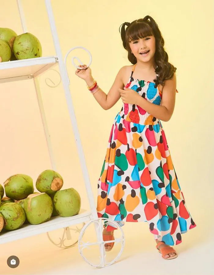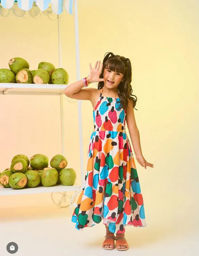 Autêntico, elegante e cheio de vivacidade, o Vestido Infantil Midi Caju Tropical encanta pela sua proposta alegre com toque refinado. A estampa marcante de cajus coloridos cria uma composição moderna e sofisticada, perfeita para destacar a beleza da infância com originalidade e charme.