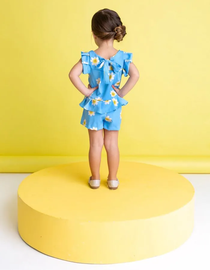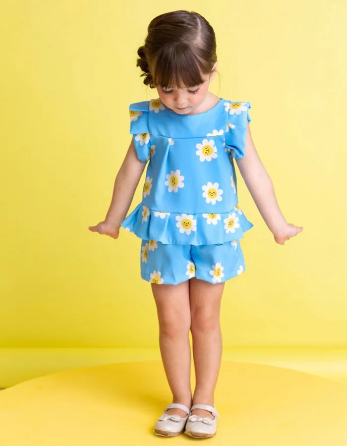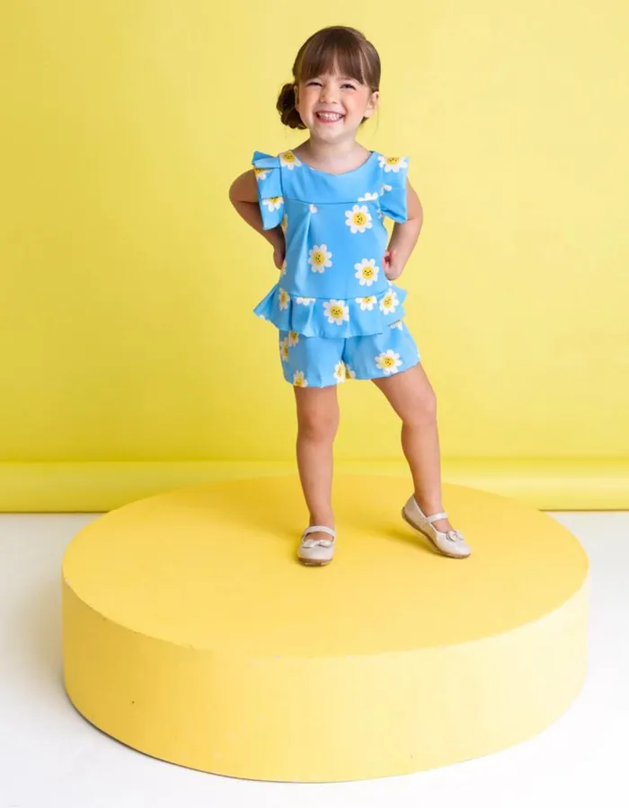 Esse look é simplesmente encantador! Com uma estampa delicada de margaridas sorridentes sobre o fundo azul, ele transmite leveza, alegria e aquele toque lúdico que conquista à primeira vista. ✨😊