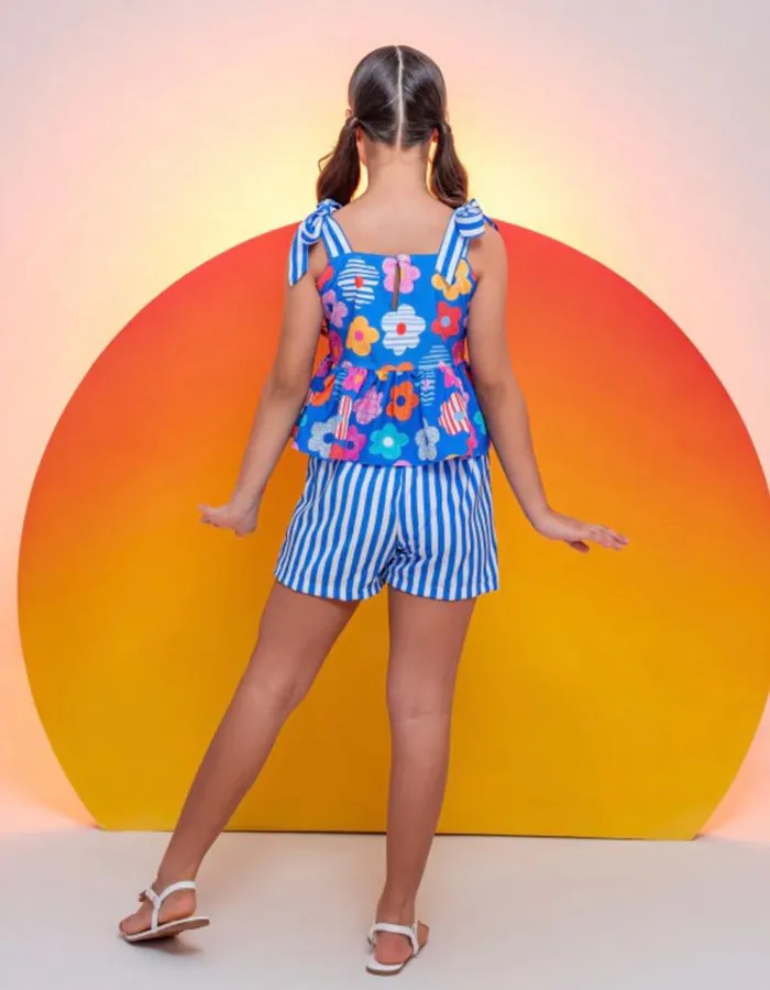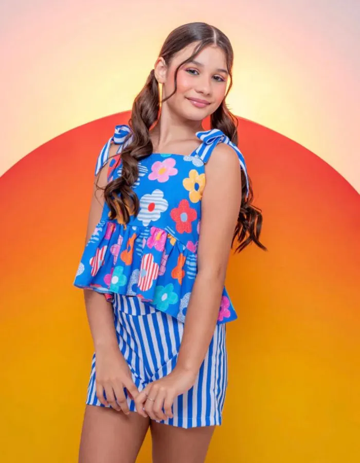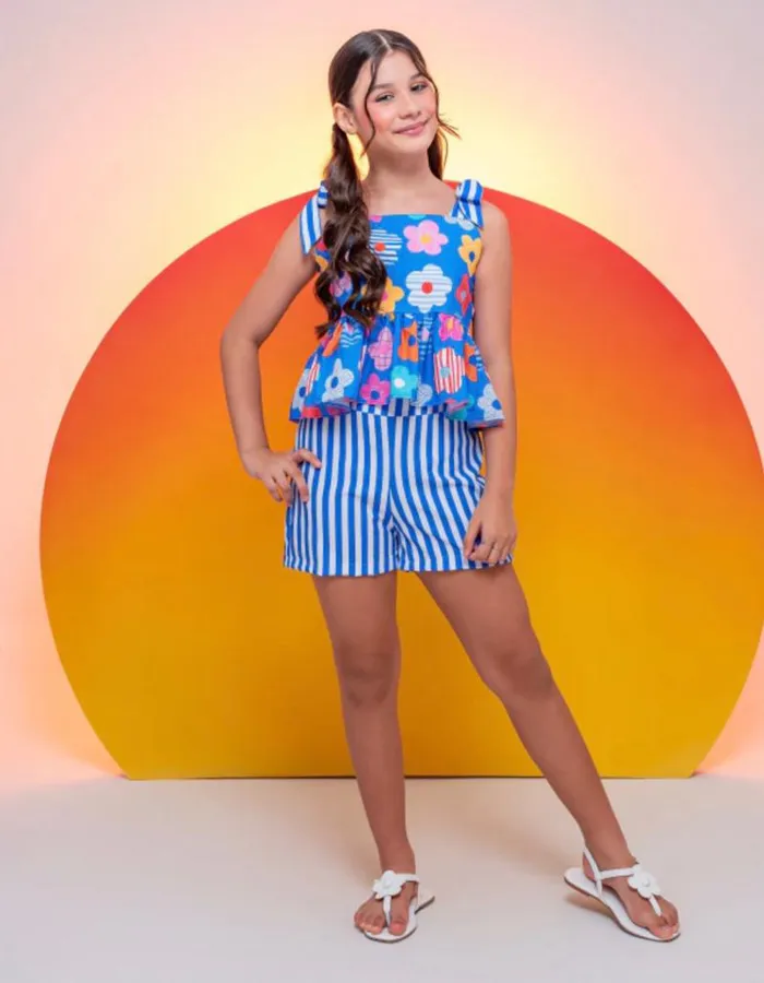 CONJUNTO FLORAL AZUL SHORT LISTRADO