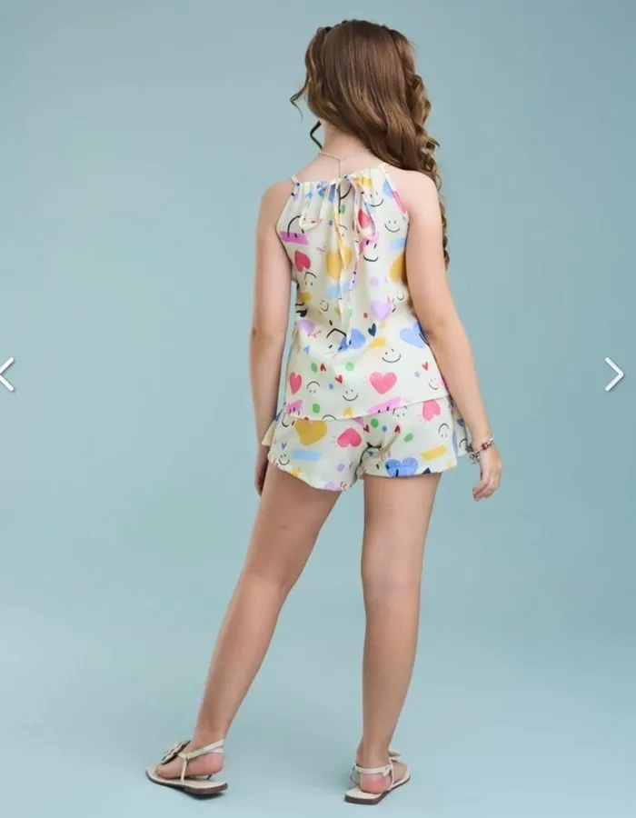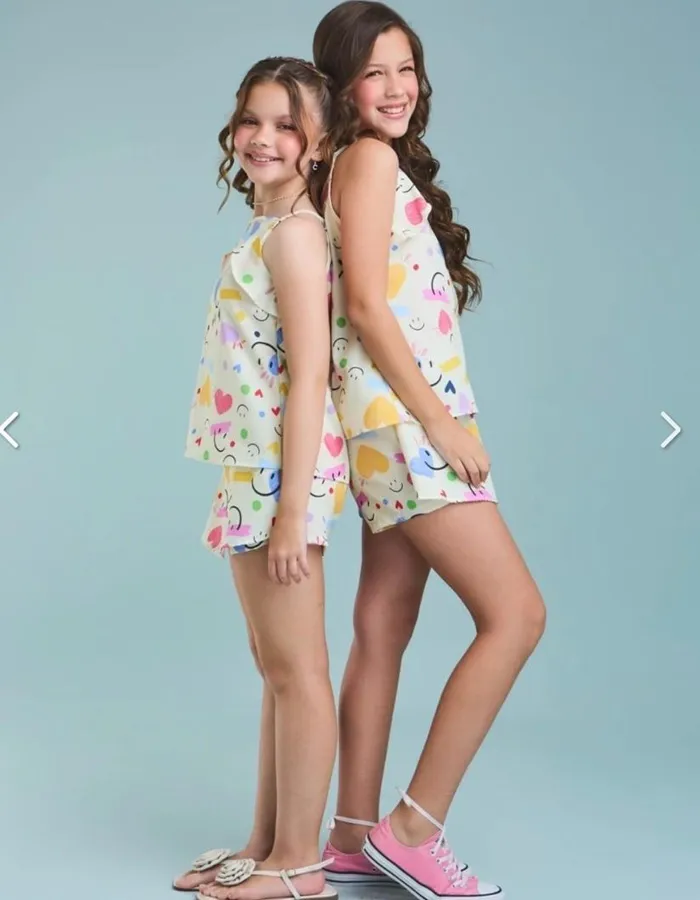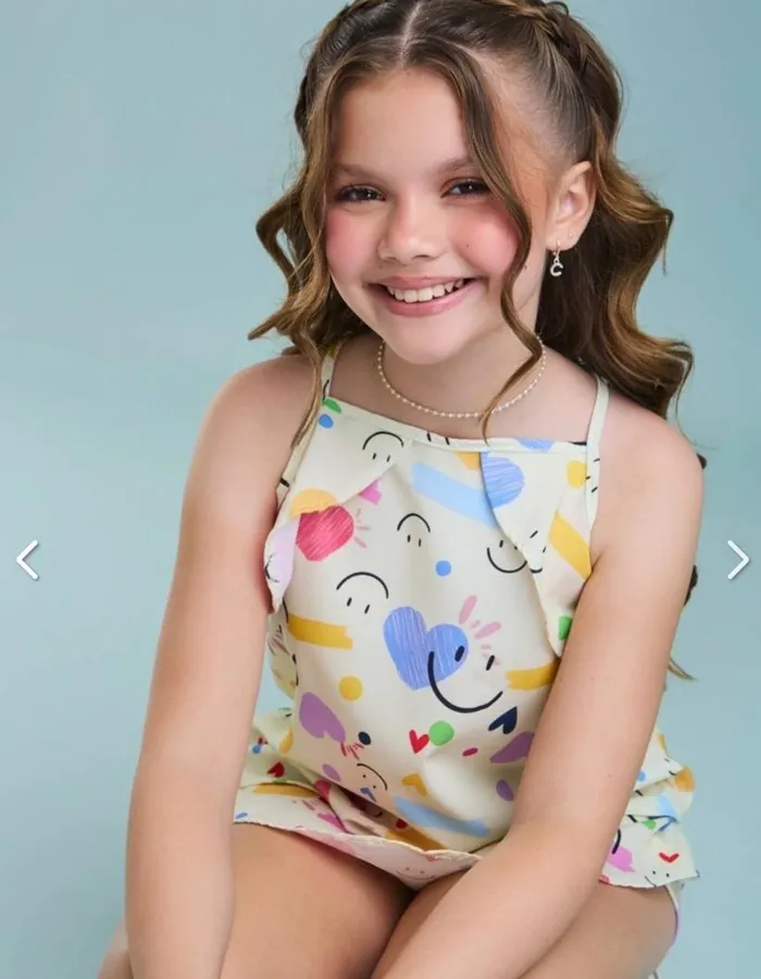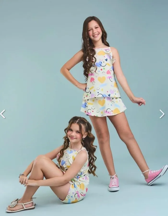 O Conjunto foi criado para meninas que amam um visual alegre, moderno e cheio de elegância. Feito em tecido crepe especial estampado, proporciona leveza e um toque sofisticado ao look infantil.