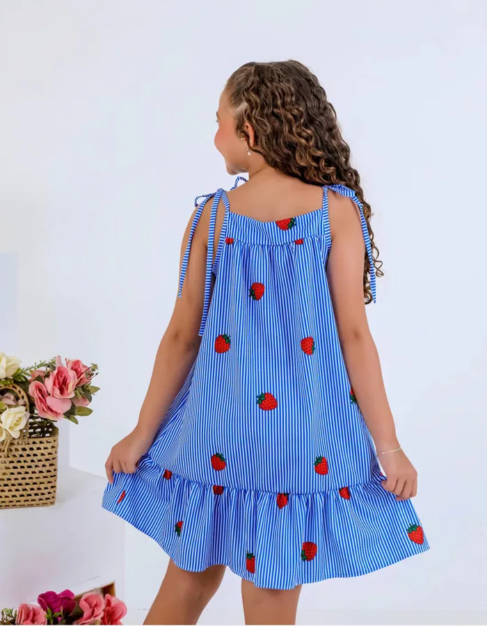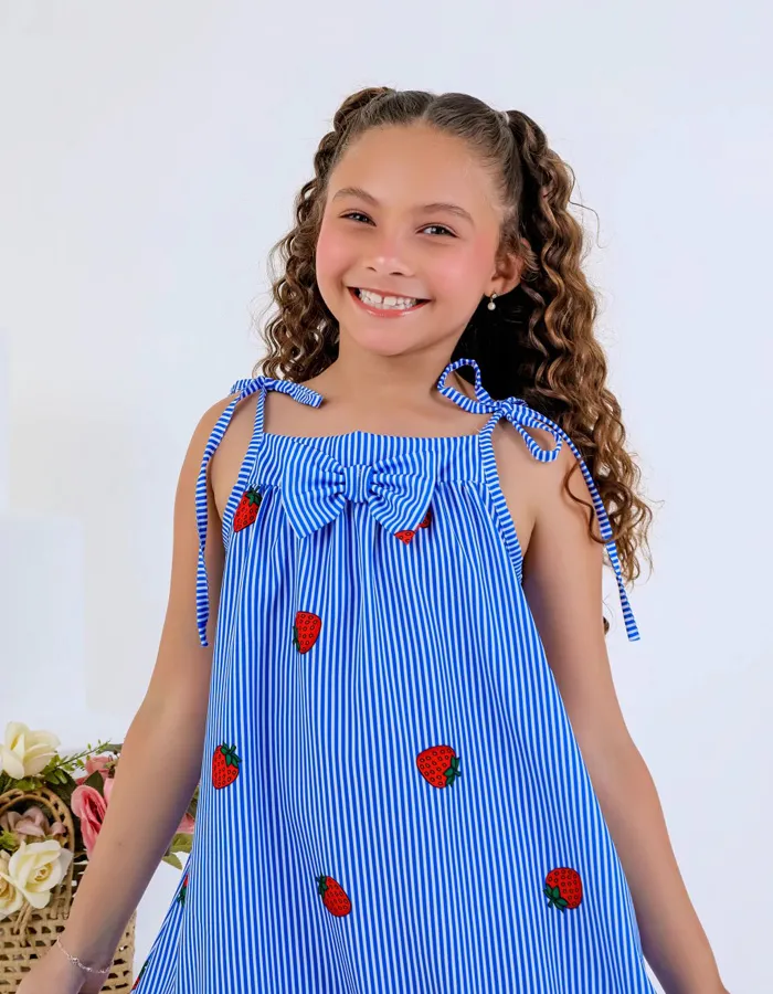 Um vestido encantador, alegre e cheio de charme para deixar a sua pequena ainda mais linda. Com listras delicadas em azul e branco, aplicação de moranguinhos e um laço frontal super charmoso, essa peça traz um visual doce, leve e apaixonante.
