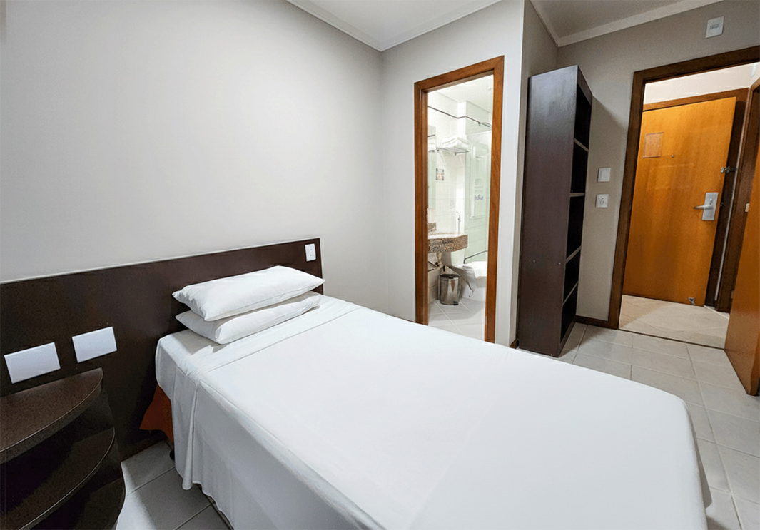 Segundo quarto com 1 cama de solteiro, banheiro privativo, chuveiro com água quente, secador de cabelo, cofre, ar condicionado, internet wi-fi e TV a cabo.